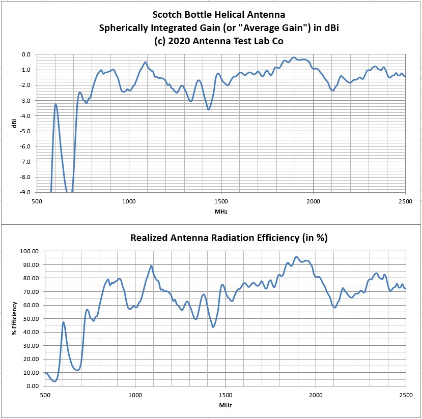 Scotch Bottle Helical Antenna Measured Efficiency vs Frequency