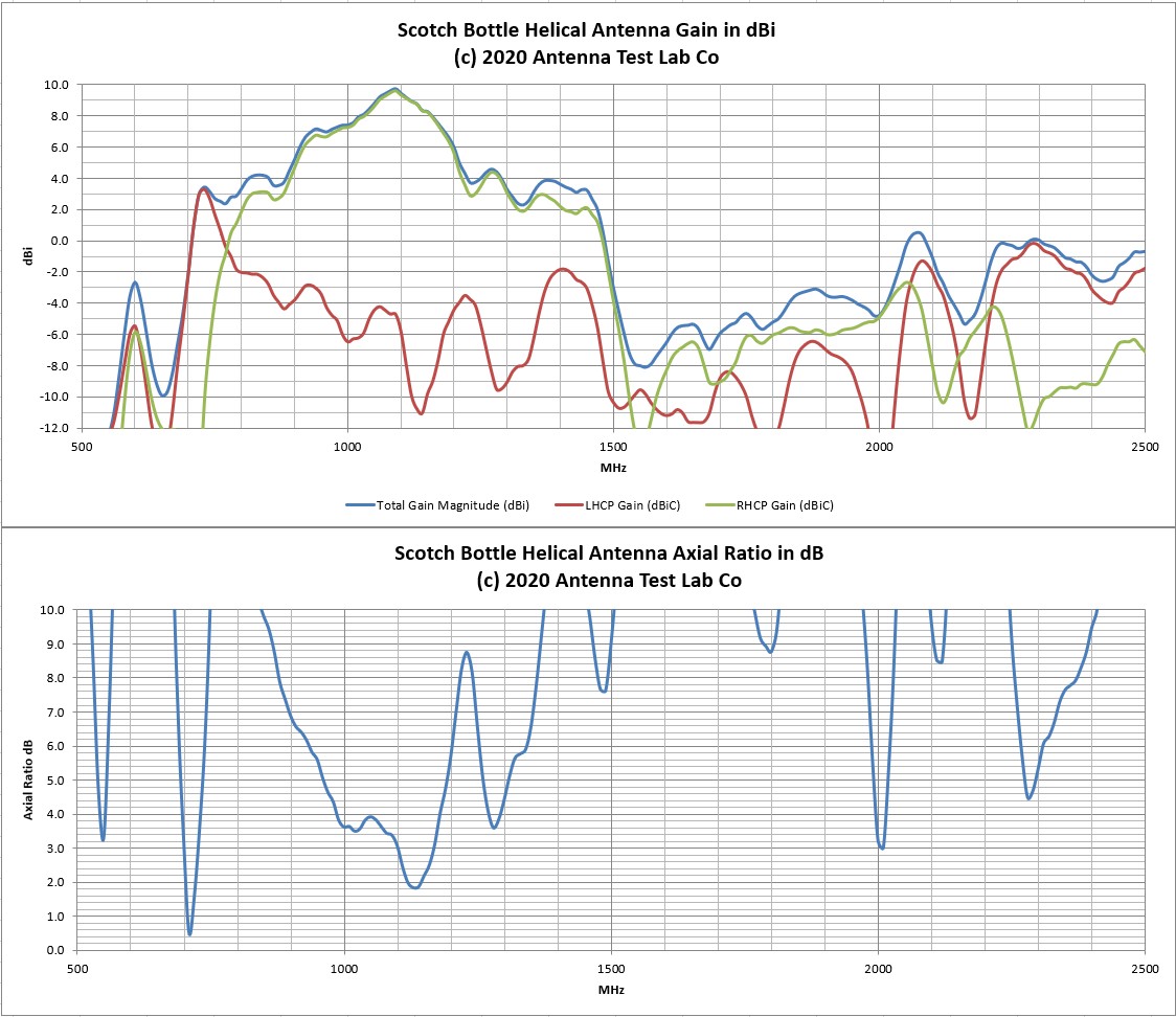 Scotch Bottle Helical Antenna Measured Gain vs Frequency
